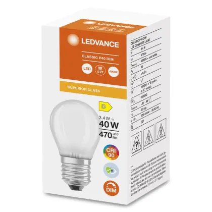 Beschrijving Ledvance Superior Classic LED E27 Kogel Mat 3.4W 470lm - 940 Koel Wit | Dimbaar - Beste Kleurweergave