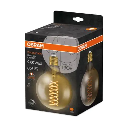Beschrijving Osram Vintage 1906 LED E27 Globe Filament Goud 8.4W 806lm - 824 Zeer Warm Wit | Vervangt 60W - Dimbaar