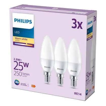 Beschrijving Voordeelpak 3x Philips Lamp LED E14 Kaars Mat 3W 250lm - 827 Zeer Warm Wit